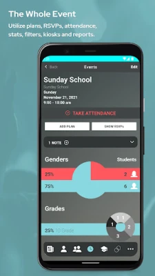 Take attendance at every ministry gathering and view quick stats including gender breakdown, staff to student ratios and school/grade representation.