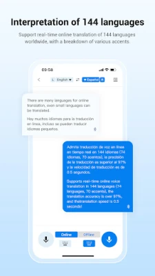 Supports real-time online voice translation in 127 languages (71 languages, 56 accents), with high translation accuracy and fast translation speed.
